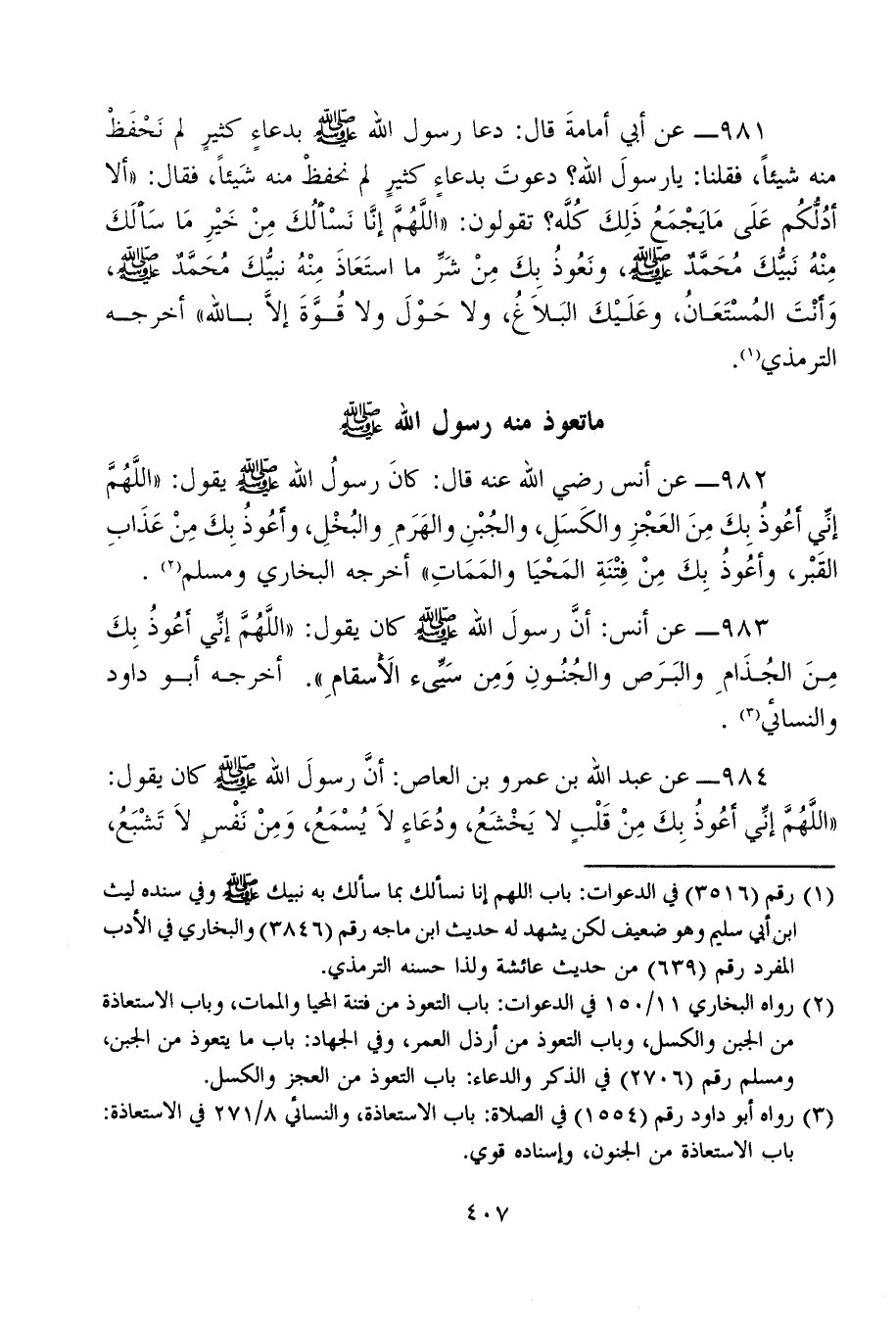 981 - عن أبي أمامةَ قال: دعا رسول الله - صلى الله عليه وسلم - بدعاءٍ كثيرٍ لم نَحْفَظْ منه شيئًا، فقلنا: يا رسولَ الله؟ دعوتَ بدعاءٍ كثيرٍ لم نحفظْ منه شَيئًا، فقال: "ألا أدُلُّكُم عَلَى مَا يَجْمَعُ ذَلِكَ كُلَّه؟ تقولون: "اللَّهُمَّ إنَّا نَسْأَلُكَ مِنْ خَيْرِ مَا سَأَلَكَ مِنْهُ نَبيُّكَ مُحَمَّدٌ - صلى الله عليه وسلم -، ونَعُوذُ بِكَ مِنْ شَرِّ ما استَعَاذَ مِنْهُ نبيُّكَ مُحَمَّدٌ - صلى الله عليه وسلم -، وَأَنْتَ المُسْتَعَانُ، وعَلَيْكَ البَلَاغُ، ولا حَوْلَ ولا قُوَّةَ إلَّا بالله" أخرجه الترمذي (¬1).