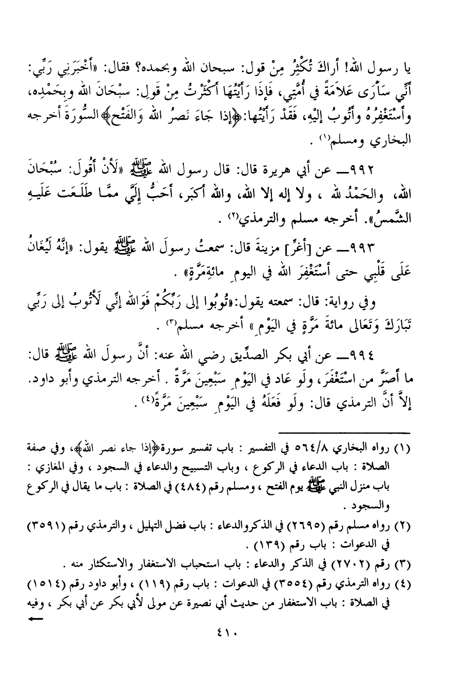 994 - عن أبي بكر الصدِّيق رضي الله عنه: أنَّ رسولَ الله - صلى الله عليه وسلم - قال: ما أَصَرَّ من اسْتَغْفَرَ، ولَو عَاد في اليَوْمِ سَبْعِينَ مَرَّةً. أخرجه الترمذي وأبو داود. إلَّا أنَّ الترمذي قال: ولَو فَعَلَهُ في اليَوْمِ سَبْعِينَ مَرَّةً (¬4).