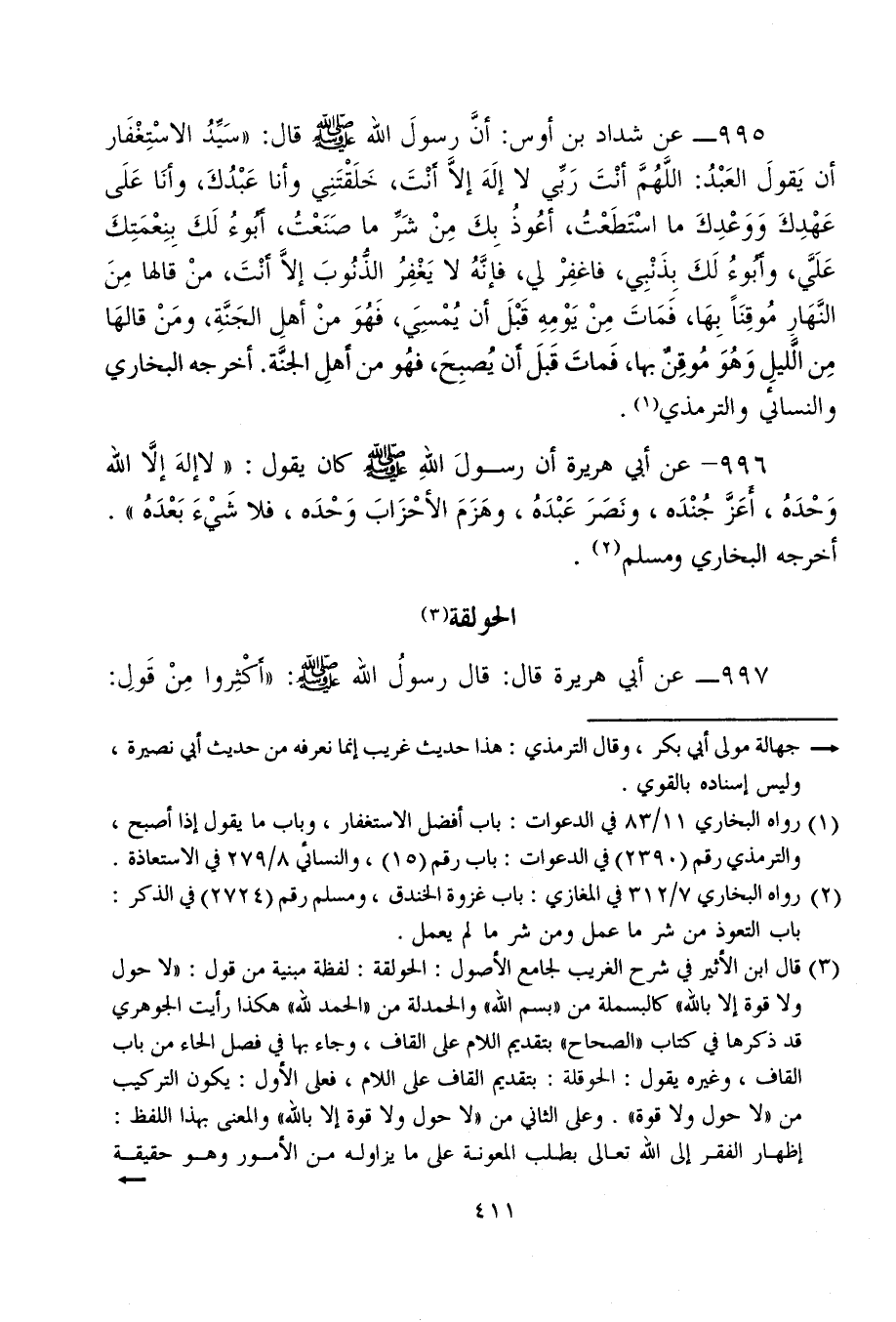 (¬1) رواه البخاري 11/ 83 في الدعوات: باب أفضل الاستغفار، وباب ما يقول إذا أصبح، والترمذي رقم (2390) في الدعوات: باب رقم (15)، والنسائي 8/ 279 في الاستعاذة.