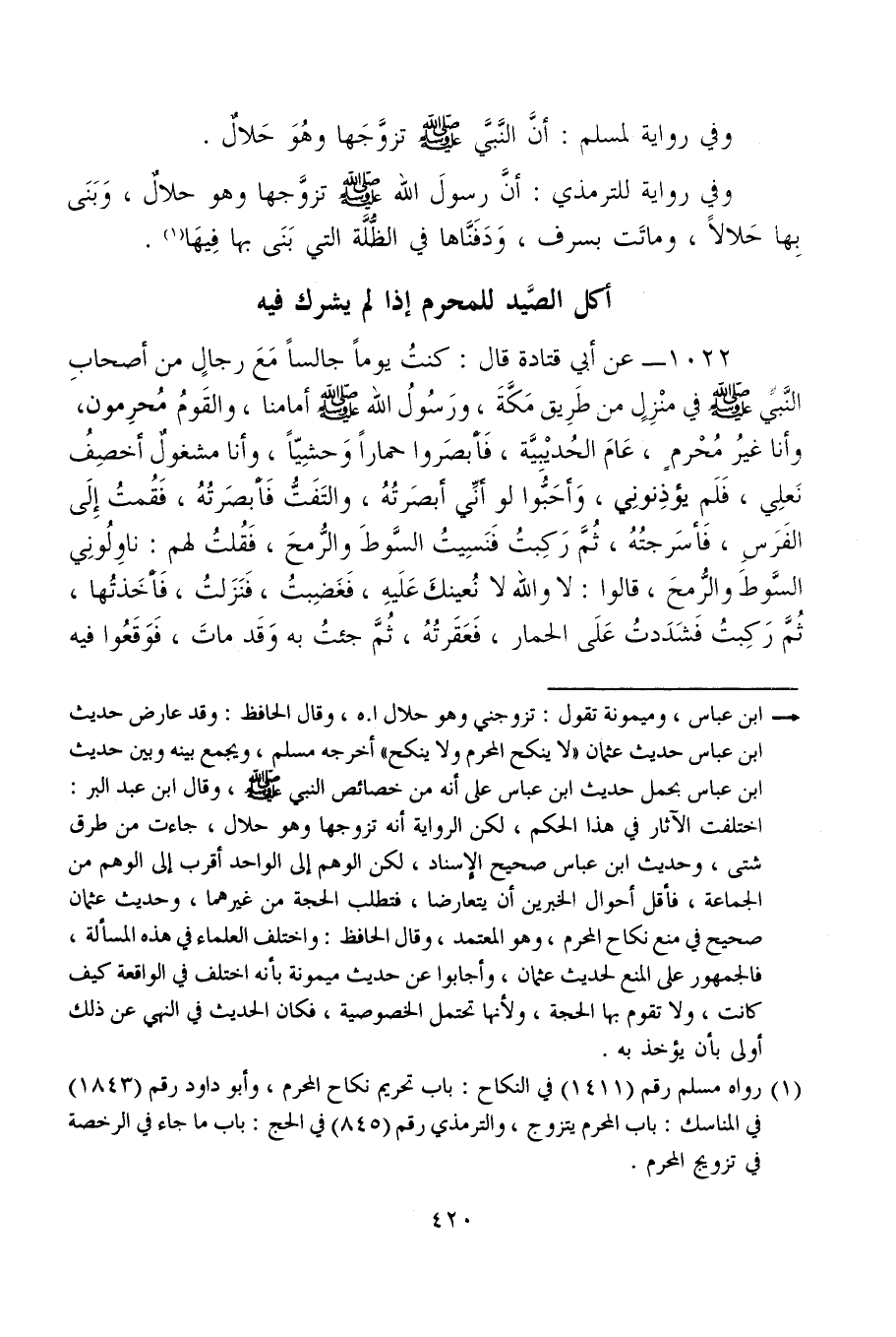 1022 - عن أبي قتادة قال: كنتُ يومًا جالسًا مَعَ رجالٍ من أصحابِ النَّبيِّ - صلى الله عليه وسلم - في منْزِلٍ عن طَرِيق مَكَّةَ، ورَسُولُ الله - صلى الله عليه وسلم - أمامنا، والقَومُ مُحرِمون، وأنا غيرُ مُحْرمٍ، عَامَ الحُديْبِيَّة، فَأبصَروا حمارًا وَحشِيًّا، وأنا مشغولٌ أخصِفُ نَعلِي، فَلَم يؤذِنونِي، وَأَحَبُّوا لو أَنِّي أَبصَرتُهُ، والتَفَتُّ فَأَبصَرتُهُ، فَقُمتُ إِلَى الفَرَسِ، فَأَسرَجتُهُ، ثُمَّ رَكِبتُ فَنَسِيتُ السَّوطَ والرُّمحَ، فَقُلتُ لهم: ناوِلُونِي السَّوطَ والرُّمحَ، قالوا: لا والله لا نُعينكَ عَلَيهِ، فَغَضِبتُ، فَنَزَلتُ، فَأَخَذتُها، ثُمَّ رَكِبتُ فَشَدَدتُ عَلَى الحمار، فَعَقَرتُهُ، ثُمَّ جئتُ به وَقَد ماتَ، فَوَقَعُوا فيه