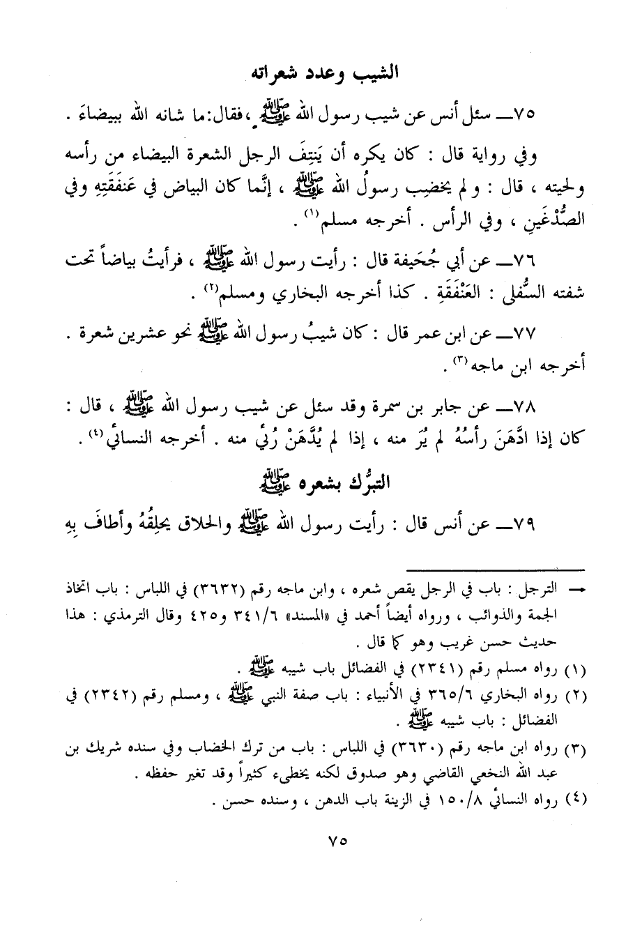 77 - عن ابن عمر قال: كان شيبُ رسول الله - صلى الله عليه وسلم - نحو عشرين شعرة. أخرجه ابن ماجه (¬3).