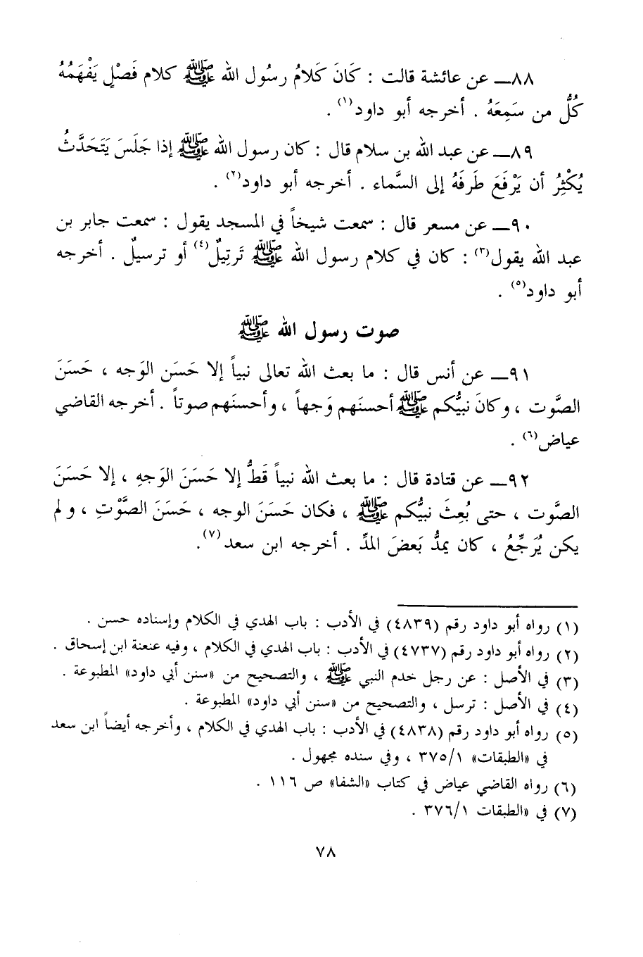 88 - عن عائشة قالت: كَانَ كَلامُ رسُول الله - صلى الله عليه وسلم - كلام فَصْلٍ يَفْهَمُهُ كُلُّ من سَمِعَهُ. أخرجه أبو داود (¬1).