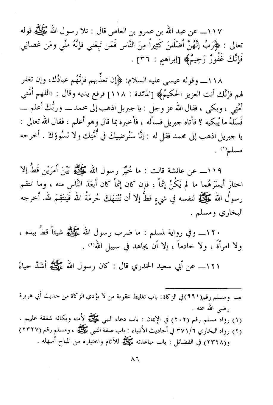 117 - عن عبد الله بن عمرو بن العاص قال: تلا رسول الله - صلى الله عليه وسلم - قوله تعالى: {رَبِّ إِنَّهُنَّ أَضْلَلْنَ كَثِيرًا مِنَ النَّاسِ فَمَنْ تَبِعَنِي فَإِنَّهُ مِنِّي وَمَنْ عَصَانِي فَإِنَّكَ غَفُورٌ رَحِيمٌ} [إبراهيم: 36].