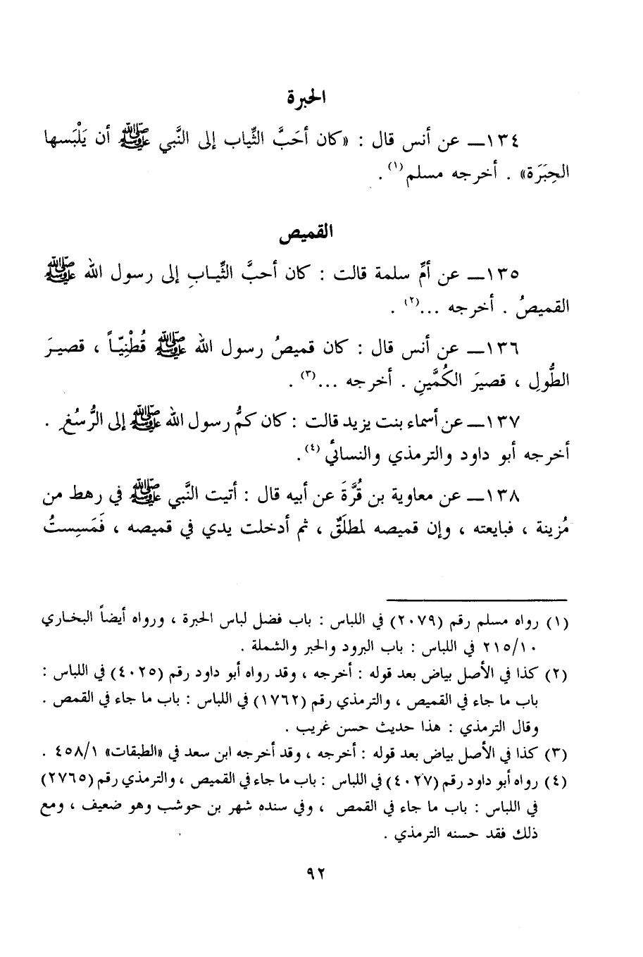 134 - عن أنس قال: "كان أحَبَّ الثِّياب إلى النَّبي - صلى الله عليه وسلم - أن يَلْبَسها الحِبَرَة". أخرجه مسلم (¬1).