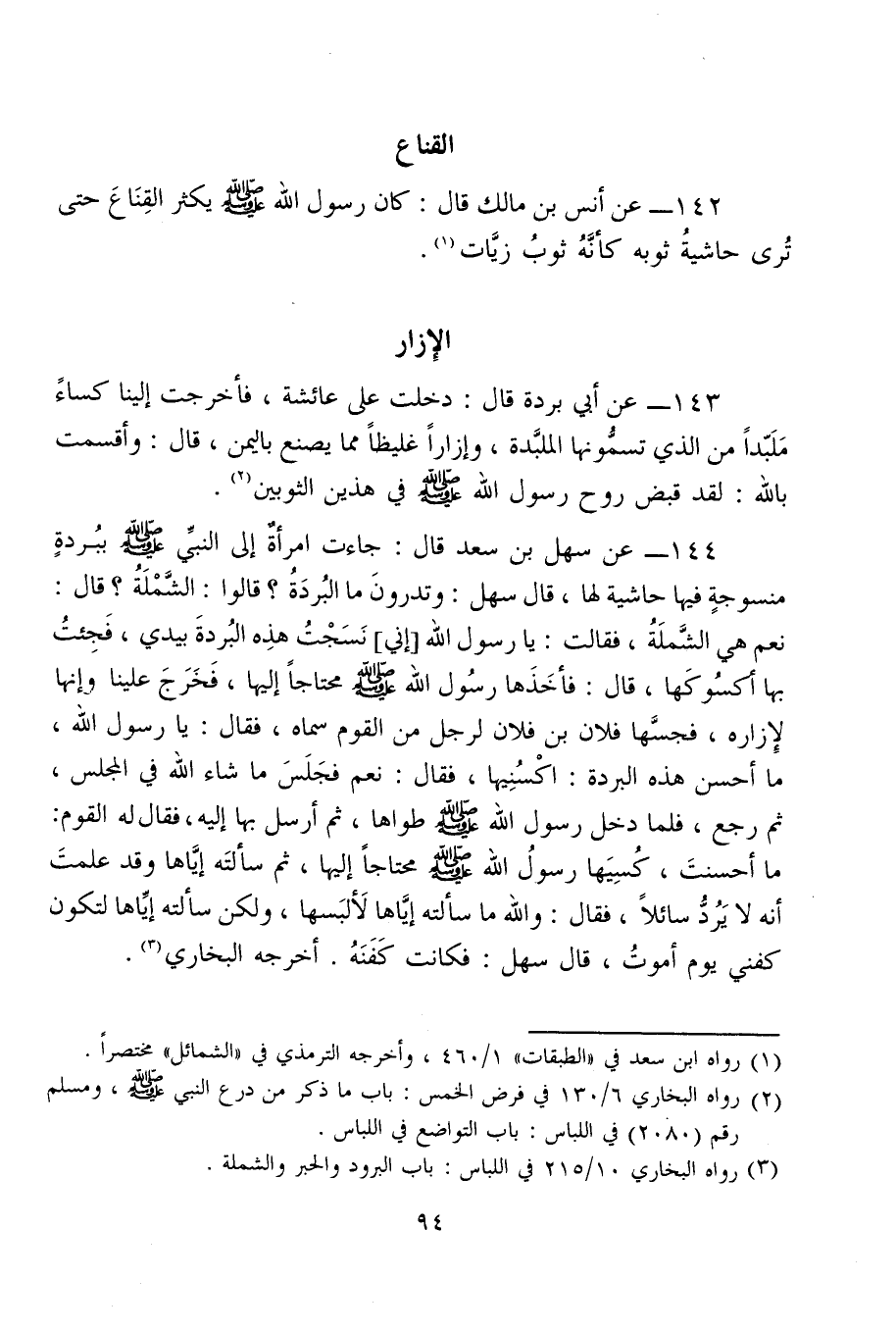 143 - عن أبي بردة قال: دخلت على عائشة، فأخرجت إلينا كساءً مَلَبَّدًا من الذي تسمُّونها الملبَّدة، وإزارًا غليظًا مما يصنع باليمن، قال: وأقسمت بالله: لقد قبض روح رسول الله - صلى الله عليه وسلم - في هذين الثوبين (¬2).