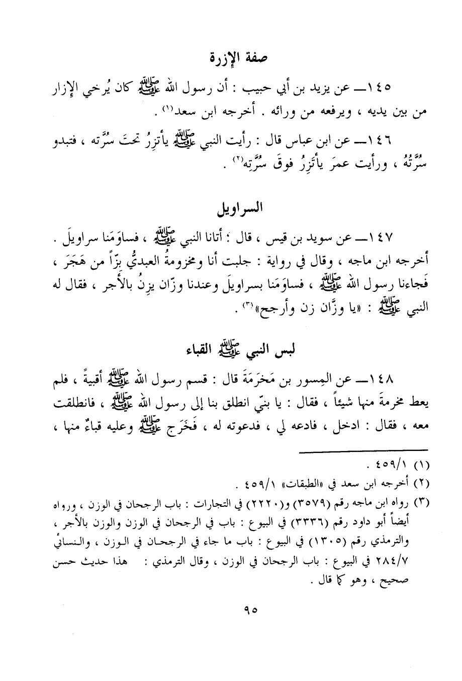 147 - عن سويد بن قيس، قال: أتانا النبي - صلى الله عليه وسلم -، فساوَمَنا سراويلَ. أخرجه ابن ماجه، وقال في رواية: جلبت أنا ومخزومةُ العبديُّ بزًّا من هَجَرَ، فَجاءنا رسول الله - صلى الله عليه وسلم -، فساوَمَنا بسراويلَ وعندنا وزّان يزِنُ بالأجر، فقال له النبي - صلى الله عليه وسلم -: "يا وزَّان زن وأرجح" (¬3).