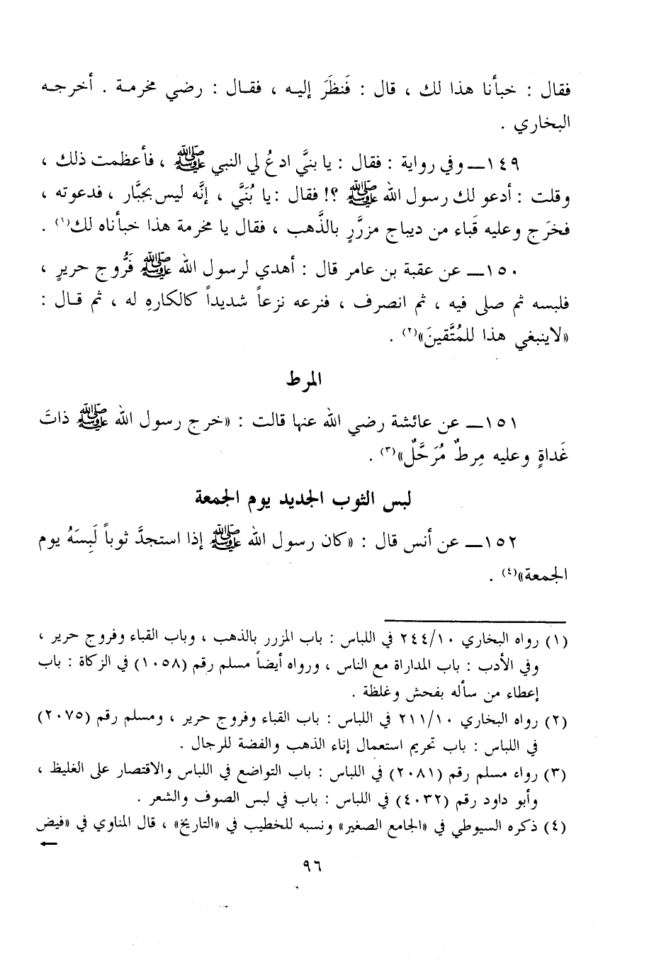 151 - عن عائشة رضي الله عنها قالت: "خرج رسول الله - صلى الله عليه وسلم - ذاتَ غَداةٍ وعليه مِرطٌ مُرَحَّلٌ" (¬3).