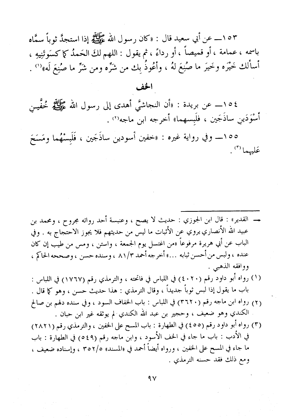154 - عن بريدة: "أن النجاشيَّ أهدى إلى رسول الله - صلى الله عليه وسلم - خُفَّينِ أَسْوَدَينِ ساذَجَين، فلَبِسهما" أخرجه ابن ماجه (¬2).