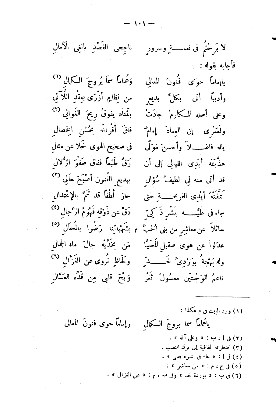يا إماماً حوَى فُنونَ المعالِي ... وَهُماماً سمَا بُروجَ الكمالِ