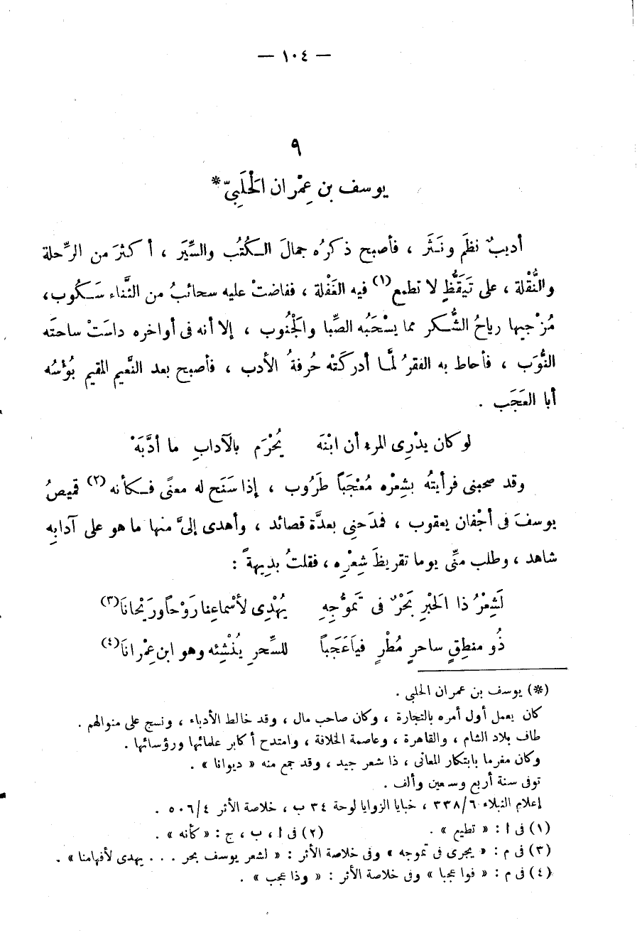 أديبٌ نظَم ونَثَر، فأصبح ذكرُه جمالَ الكُتُب والسِّيَر، أكثرَ من الرِّحلة والنُّقْلة، على تَيَقُّظٍ لا تطمع فيه الغَفْلة، ففاضتْ عليه سحائبُ من الثَّناء سَكُوب، مُزْجيها رياحُ الشُّكر مما يسْحَبُه الصِّبا والْجَنُوب، إلا أنه في أواخره داسَتْ ساحتَه النُّوَب، فأحاط به الفقرُ لمَّا أدركَتْه حُرفُة الأدب، فأصبح بعد النَّعيم المقيم بُؤْسُه أبا العَجَب.