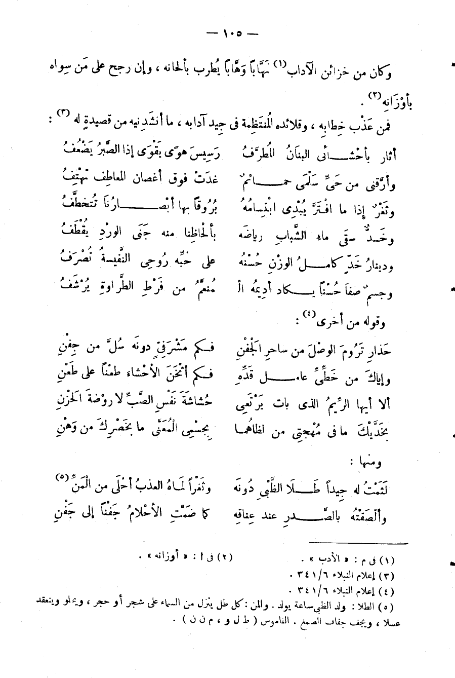 وكان من خزائن الآداب نَهَّاباً وَهَّاباً بألحانه، وإن رجح على مَن سِواه بأوْزَانِه.