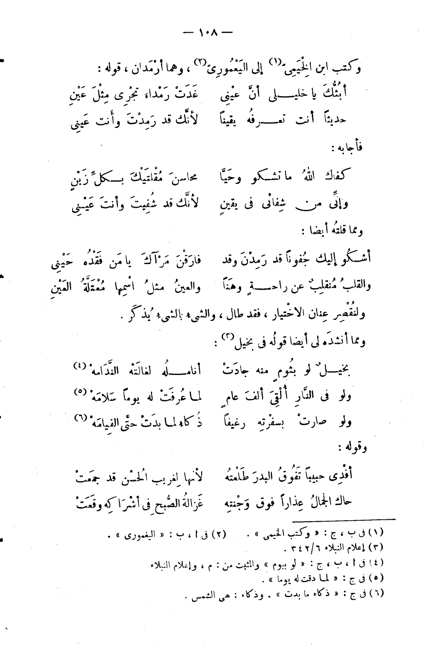 أبُثُّكَ يا خليلي أنَّ عيْنِي ... غَدَتْ رَمْداءَ تجْرِي مِثْلَ عَيْنِ