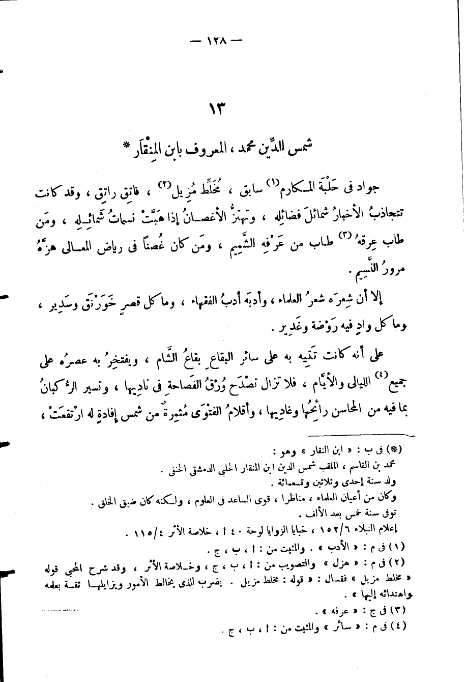 على أنه كانت تَتِيه به على سائر البقاعِ بقاعُ الشَّام، ويفتخِرُ به عصرُه على جميع الليالي والأيَّام، فلا تزال تصْدَح وُرْقُ الفَصاحةِ في نادِيها، وتسير الرُّكبانُ بما فيه من المحاسن رائِحُها وغادِيها، وأقلامُ الفتْوَى مُثمِرةٌ من شمس إفادةٍ له ارْتفعَتْ،