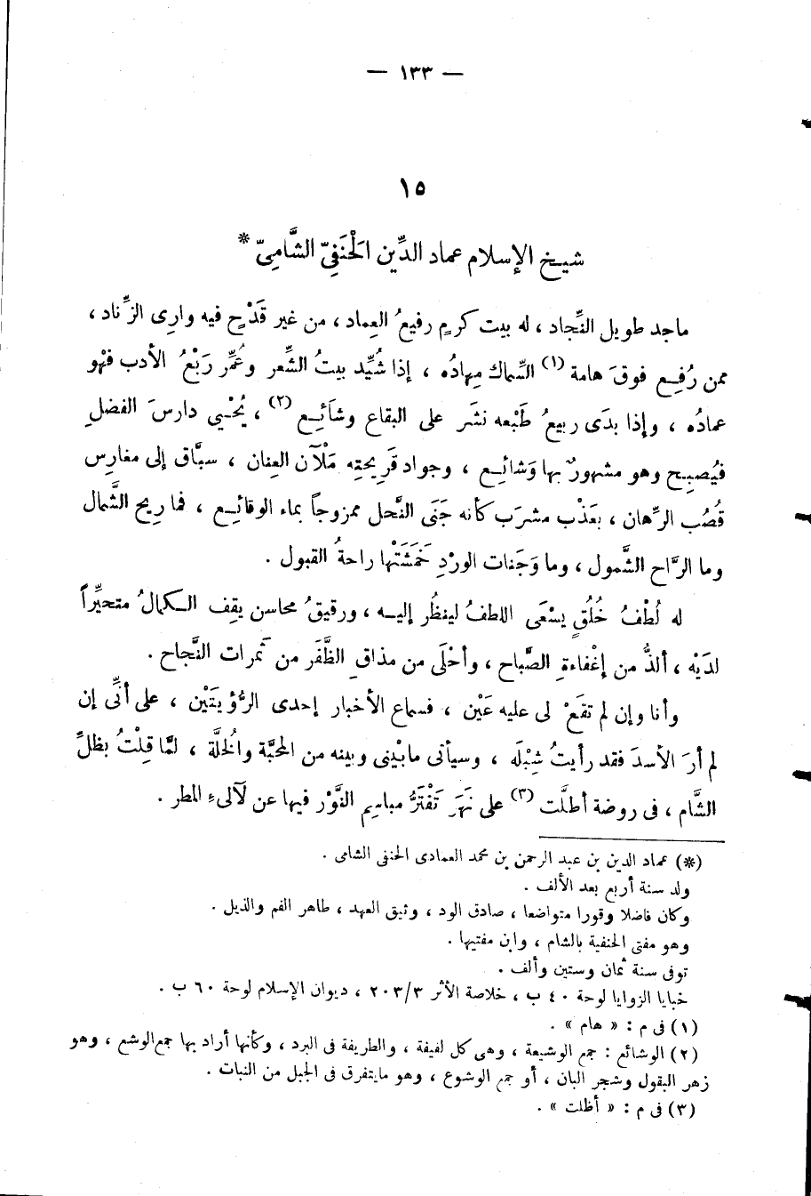 ماجد طويل النِّجاد، له بيت كرمٍ رفيعُ العِماد، من غير قَدْحٍ فيه وارِى الزِّناد، ممن رُفِع فوقَ هامة السِّماك مِهادُه، إذا شُيِّد بيتُ الشِّعر وعُمِّر رَبْعُ الأدب فهْو عمادُه، وإذا بدَى ربيعُ طَبْعه نشَر على البقاع وشَائِع، يُحْيي دارسَ الفضلِ فيُصبِح وهو مشهورٌ بها وَشائِع، وجواد قَرِيحتِه مَلآْن العِنان، سبَّاق إلى مغارِس قُصُب الرِّهان، بعَذْب مشرَب كأنه جَنَى النَّحل ممزوجاً بماء الوقائِع، فما رِيح الشَّمال وما الرَّاح الشَّمول، وما وَجَنات الورْدِ خَمَشَتْها راحةُ القبول.