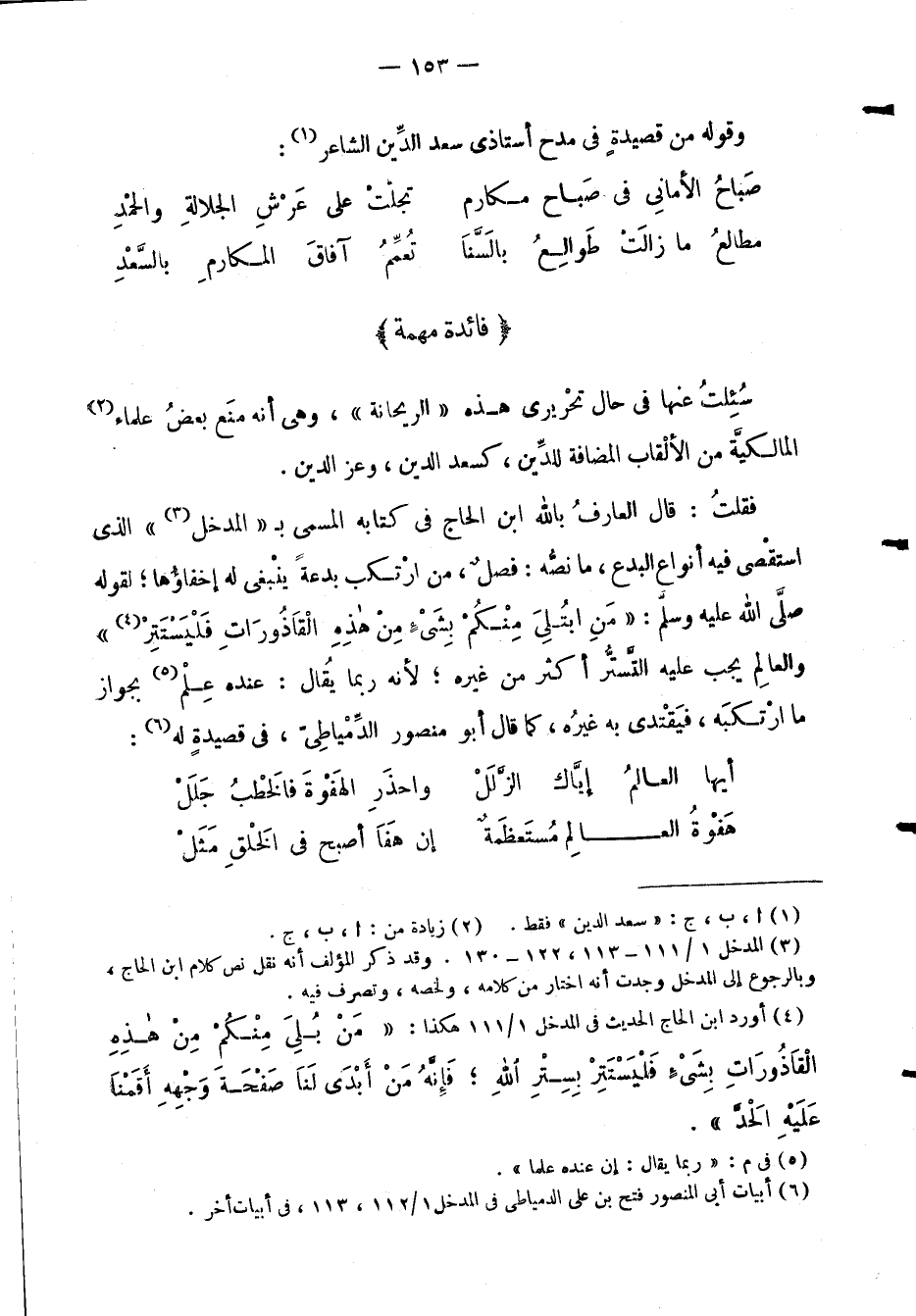 فقلتُ: قال العارفُ بالله ابن الحاج في كتابه المسمى ب) المدخل (الذي استقْصى فيه أنواع البدع، ما نصُّه: فصلٌ، من ارْتكب بدعه ينْبغي له إخفاؤُها؛ لقوله صلَّى الله عليه وسلَّم:) مَنِ ابتُلِىَ مِنْكُمْ بِشَيْءٍ مِنْ هذِهِ الْقَاذُورَات فَلْيَسْتَتِرْ (والعالِم يجب عليه التَّستُّر أكثر من غيره؛ لأنه ربما يُقال: عنده عِلْم بجواز ما ارْتكبَه، فيَقْتدي به غيرُه، كما قال أبو منصور الدِّمْياطِيّ، في قصيدةٍ له: