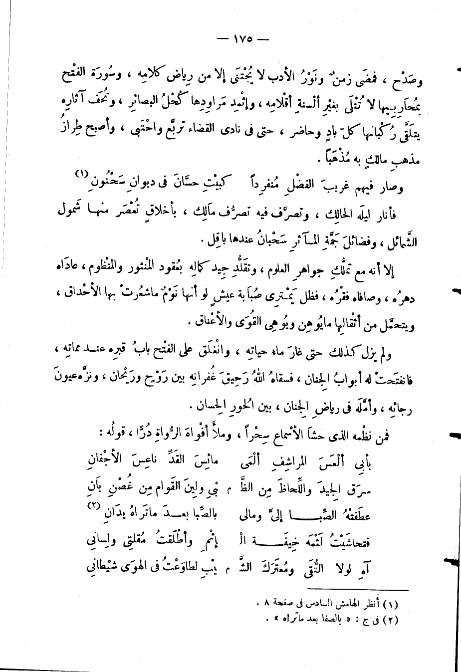 وصَدْح، فمضَى زمنٌ ونَوْرَ الأدب لا يُجْتنَى إلا من رِياض كلامِه، وسُورَة الفتْح بمُحَارِبِيها لا تُتْلَى بغيْرِ ألْسنةِ أقْلامهِ، وإثْمِد مَراوِدِها كُحْلُ البصائرِ، وتُحَف آثارِه يتلَقَّى رُكْبانها كلّ بادٍ وحاضر، حتى في نادي القضاء تربَّع واحْتَبى، وأصبح طِرازُ مذهبِ مالكٍ به مُذْهَباً.