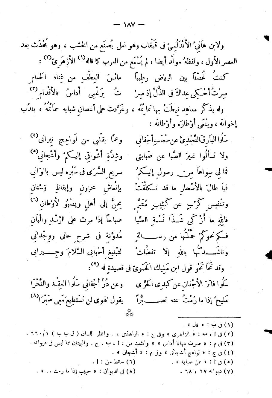 وله يذكُر معاهِد نِيطَتْ بها تمائِمهُ، وغَرَّدت على أغصانِ شبابه حمَائمُهُ، يندُب إخوانَه، وينْعَى أوْطارَه وأوْطانه: