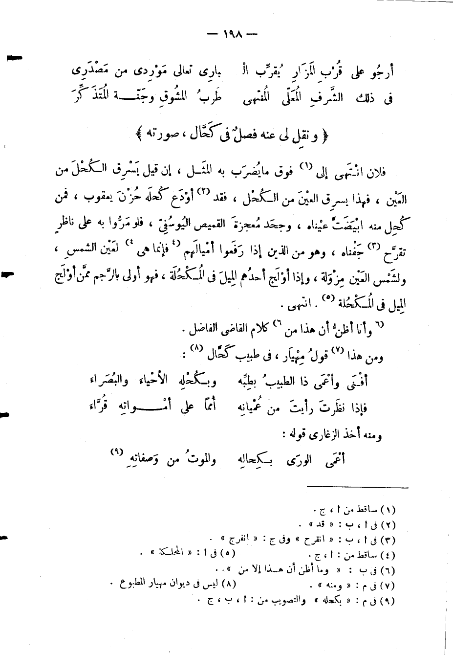 ) ونقلِ لي عنه فصلٌ في كَحَّال، صورته (فلان انْتَهى إلى فوق ما يُضرَب به المثَل، إن قيل يَسْرِق الكُحْلَ من العَيْن، فهذا يسرِق العيْنَ من الكُحْل، فقد أوْدَع كُحلَه حُزْنَ يعقوب، فمن كُحِل منه ابْيَضَتَّ عيْناه، وجحَد مُعجزةَ القميص اليُوسُفِيّ، فلو مَرُّوا به على ناظرِ تقرَّح جَفْناه، وهو من الذين إذا رَفَعوا أمْيالَهم فإنما هي لعَيْن الشمسِ، ولشَمْس العين مِزْوَلة، وإذا أوْلَج أحدُهم المِيلَ في المُكْحُلَة، فهو أولى بالرَّجم ممَّن أوْلَج المِيل في المُكْحُلة انتهى.