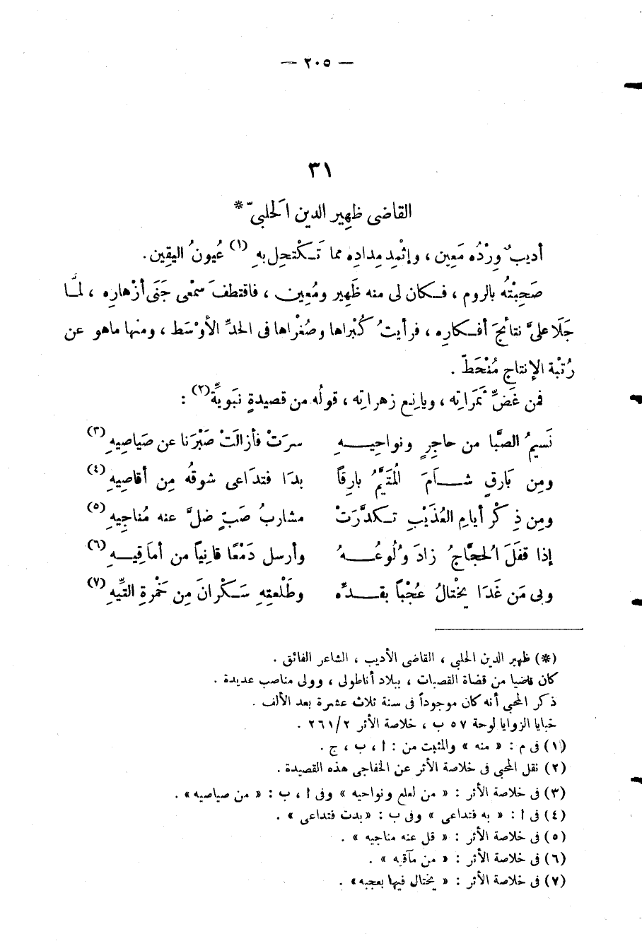 صَحِبْتُه بالروم، فكان لي منه ظَهِير ومُعِين، فاقتطفُ سمْعي جَنَى أزْهارِه، لمَّا جَلاَ علىَّ نتائجَ أفكارِه، فرأيتُ كُبْراها وصُغْراها في الحدِّ الأوْسَط، ومنها ما هو عن رُتْبة الإنتاجِ مُنْحَطّ.