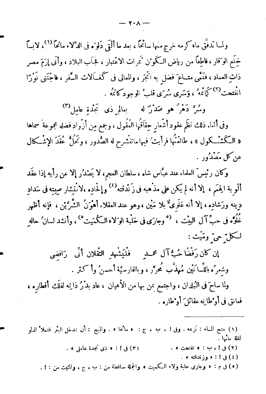 وكان رئيس العلماء عند عبَّاس شاه، سلطان العجم، لا يَصْدُر إلا عن رأيه إذا عقَد ألْوِية الهِمَم، إلا أنه لم يكن على مذْهبه في زَنْدقته وإلْحادِه لانْتِشار صِيتِه في سَدادِ دِينه ورَشادِه، إلا أنه عَلَوِيُّ بلا مَيْن، وهو عند العقلاء أهْوَنُ الشَّرَّيْن، فإنه أظهر غُلُوَّه في حبِّ آل البيْت، وجارَى في حَلْبة الوَلاءِ الكُمَيت، وأنشد لسانُ حالهِ لكلٍّ حيٍّ ومَيْت: