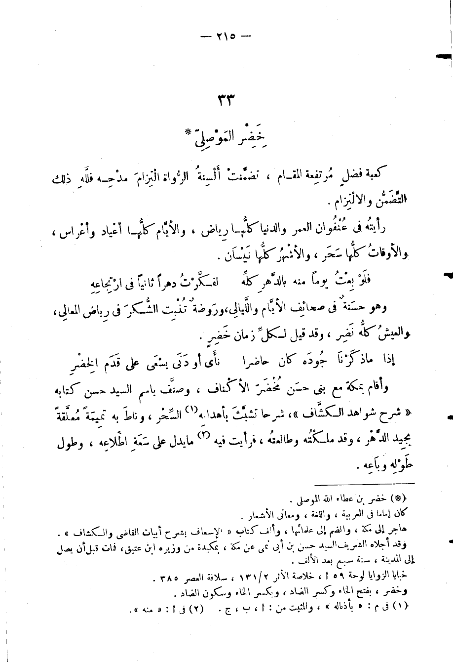 وهو حسَنةٌ في صحائِف الأيَّام واللَّيالِي، وروضةٌ تُنْبِت الشُّكرَ في رِياض المعالِي، والعيشُ كلُّه نَضِر، وقد قيل لكلِّ زمان خَضِرٍ.