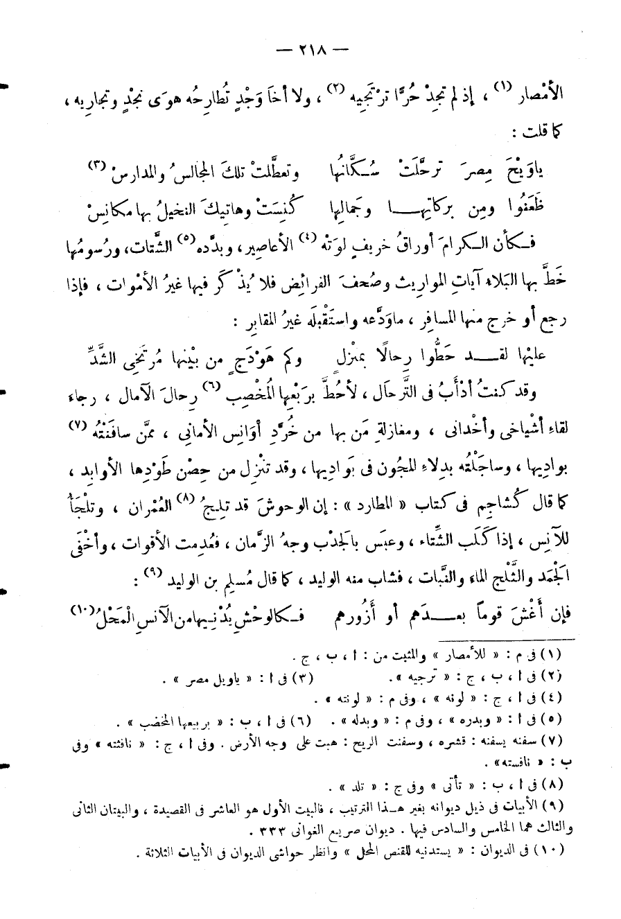 وقد كنتُ أدْأَبُ في التَّرحال، لأحُطَّ برَبْعِها المُخْصِب رِحالَ الآمال، رجاءُ لقاءِ أشْياخي وأخْداني، ومغازلةِ مَن بها من خُرَّدِ أوَانِس الأمانِي، ممَّن سافَنْتُه بوادِيها، وساجَلْتُه بدِلاءِ المجُون في بَوادِيها، وقد تنْزِل من حِصْن طَوْدِها الأوابِد، كما قال كُشاجِم في كتاب) المطارد (: إن الوحوشَ قد تلِجْ العُمْران، وتلْجَأُ للآنِس، إذا كَلَب الشِّتاء، وعبَس بالجَدْب وجهُ الزَّمان، فعُدِمت الأقوات، وأخْفَى الْجَمَد والثَّلْج الماءَ والنَّبات، فشاب منه الوليد، كما قال مُسلِم بن الوليد:
