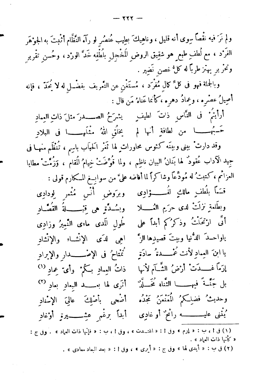 ولم نَرَ فيه نقْصاً سِوى أنه قليل، وناهِيكَ بطِيب عُنصُر لو رآه النَّظَّام أثْبتَ به الجوْهَر الفَرْد، مع لُطفِ طبعٍ هو شقِيق الروضِ المُخْجِلِ بلُطْفِه خَدَّ الورْد، وحُسنِ تقْريرٍ وتحْريرٍ يهتز طرباً له كلُّ غصنٍ نَضِير.