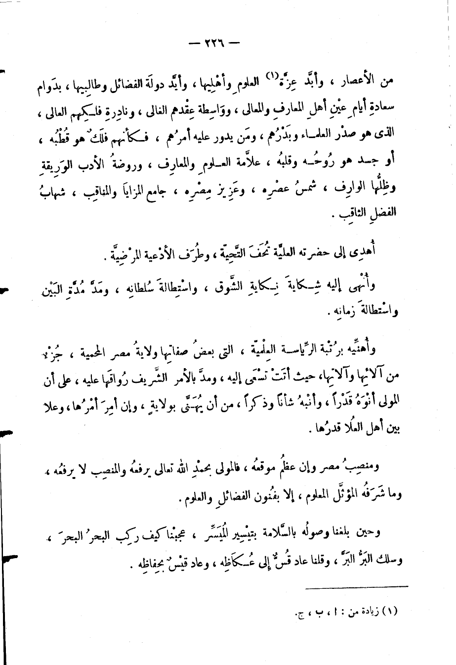 وأُهنِّيه برُتْبة الرِّياسة العِلْميّة، التي بعضُ صفاتِها ولايةُ مصر المحمية، جُزْءٌ من آلائِها وآلاتِها، حيث أتَتْ تسْعَى إليه، ومدَّ بالأمر الشَّريف رُواقَها عليه، على أن المولى أنْوَهُ قَدْراً، وأنْبهُ شأناً وذكراً، من أن يُهَنَّى بولايةٍ، وإن أمِرَ أمْرُها، وعلا بين أهل العُلا قدرُها.