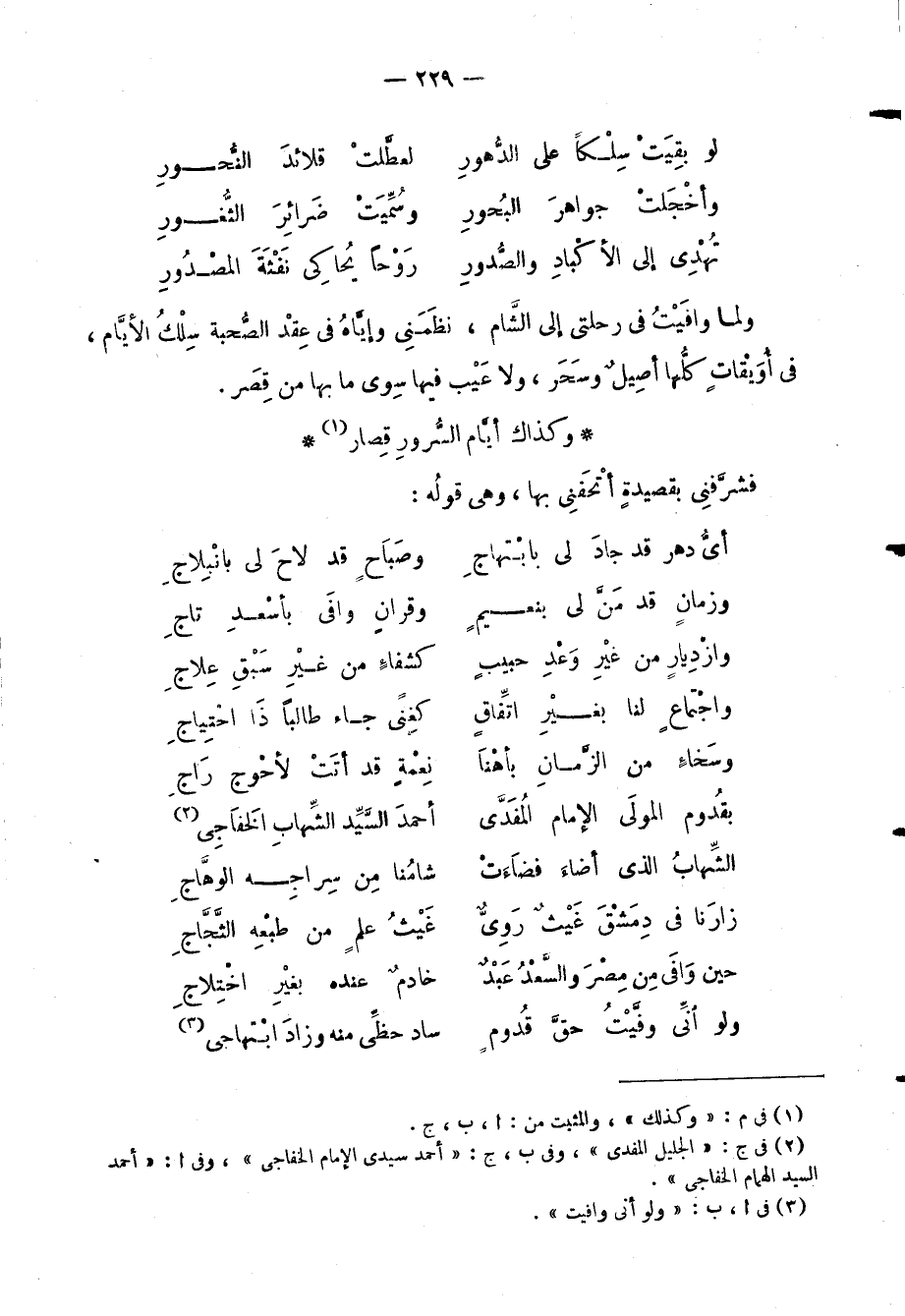 ولما وافَيْتُ في رحلتي إلى الشَّام، نظَمَنِي وإيَّاهُ في عِقْد الصُّحبة سِلْكُ الأيَّام، في أُوَيْقاتٍ كلُّها أصِيِلٌ وسَحَر، ولا عَيْب فيها سِوى ما بها من قِصَر.