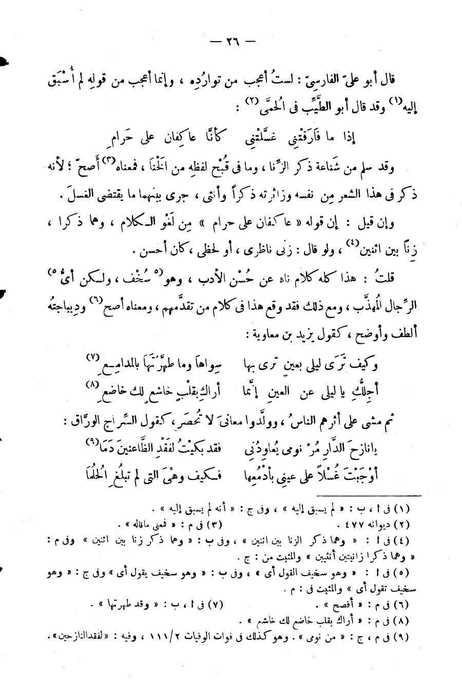 قال أبو عليّ الفارسيّ: لستُ أعجب من توارُدِه، وإنما أعجب من قولهِ لم أُسْبَق إليه وقد قال أبو الطَّيِّب في الُحمَّى: