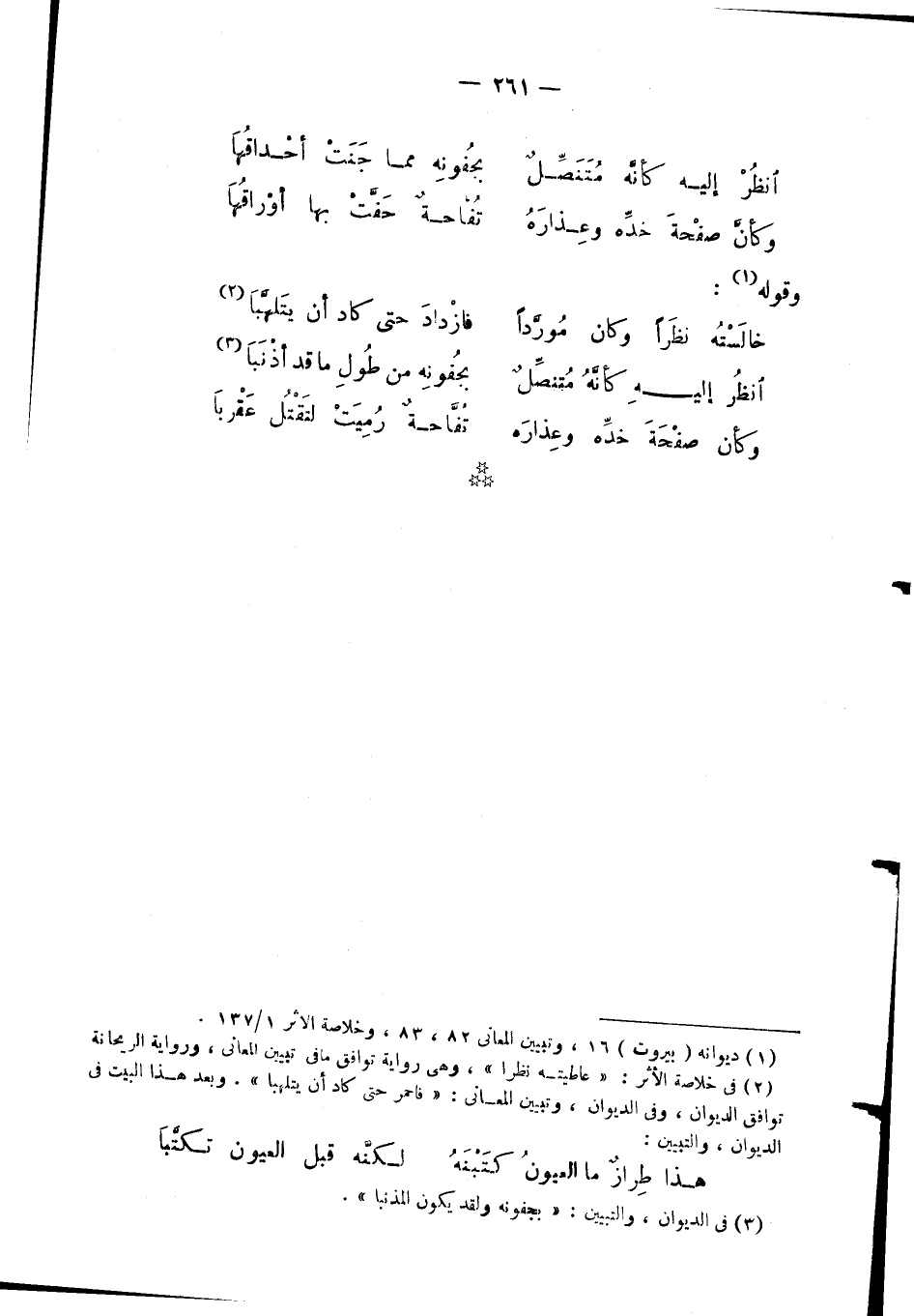 وكأن صفْحَةَ خدَّه وعِذارَه ... تُفَّاحةٌ رُمِيَتْ لتَقْتُل عَقْرباً