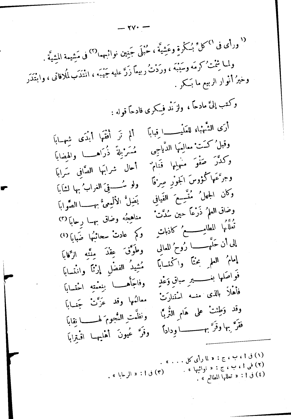 ولما شمت كرمه وسيبه، وردت ربيعاً زر عليه جيبه، انتدب لملاقاتي، وابتدر وخير أنوار الربيع ما بكر.