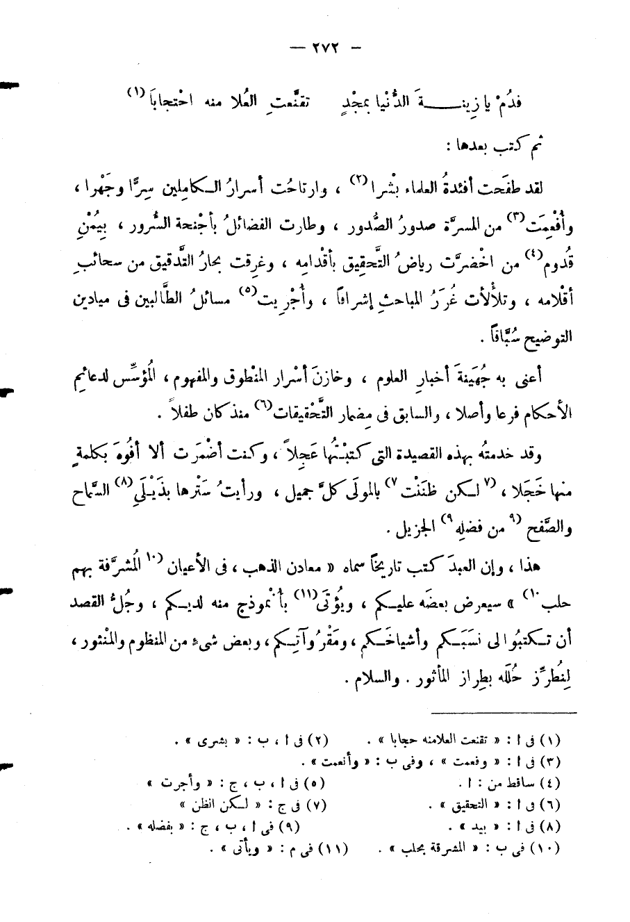أعنى به جهينة أخبار العلوم، وخازن أسرار المنطوق والمفهوم، المؤسس لدعائم الأحكام فرعاً واصلاً، والسابق في مضمار التحقيقات منذ كان طفلاً.
