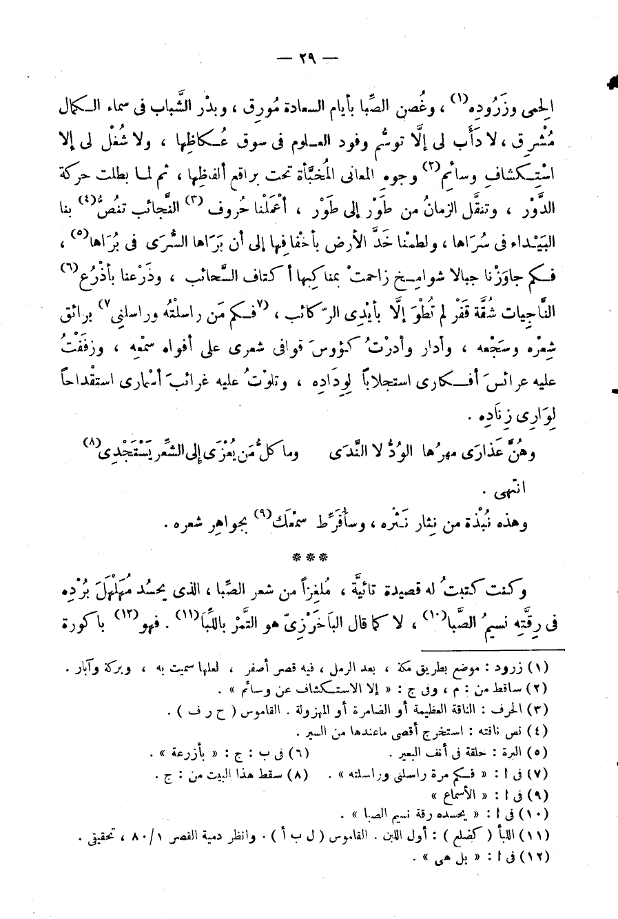 الحِمى وزَرُودِه، وغُصن الصَّبا بأيام السعادة مُورِق، وبدْر الشَّباب في سماء الكمال مُشْرِق، لا دَأَب لي ألاَّ توسُّم وفود في سوق عُكاظِها، ولا شُغْل لي إلا استكشاف وسائِم وجوهِ المعاني المُخبَّأة تحت براقع تحت براقع ألفاظِها، ثم لما بطلت حركة الدَّوْر، وتنقَّل الزمانُ من طَوْر إلى طَوْر، أْعمَلْنا حُروف النَّجائب تنُصُّ بنا البَيْداء في سُرَاها، ولطمْنا خَدَّ الأرض بأخْفافِها إلى أن بَرَاها السُّرَى في بُرَاها، فكم جاوَزْنا جبالاً شوامِخ زاحمتْ بمناكِبها أكتاف السَّحائب، وذَرْعنا بأذْرُع النَّاجِيات شُقَّة قّفْز لم تُطْوَ إلاَّ بأيْدِي الرّكائب، فكم مَن راسلْتُه وراسلنِي برائق شِعْره وسَجْعه، وأدار وأدرْتُ كؤوسَ قوافي شعره على أواه سمْعِه، وزفَفْتُ عليه عرائسَ أفكاري استجلاباً لِوِدَادِه، وتلوْتُ علي غرائبَ أسْماري استقْداحاً لِوَارِي زِنَادِه.