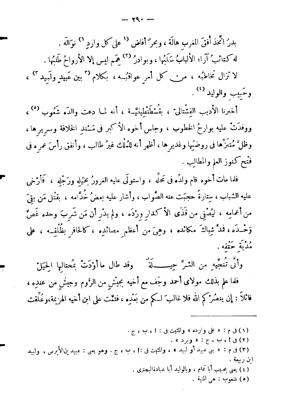 أخبرنا الأديب الفشتالي، بقسطنطينية، أنه لما دعت والده شعوب، ووفدت عليه بوارح الخطوب، وجلس أخوه الأكبر مسند الخلافة وسريرها، وظل متزها في روضتها وغديرها، أظهر أنه للملك غير طالب، وأنفق رأس عمره في فتح كنوز العلم والمطالب.