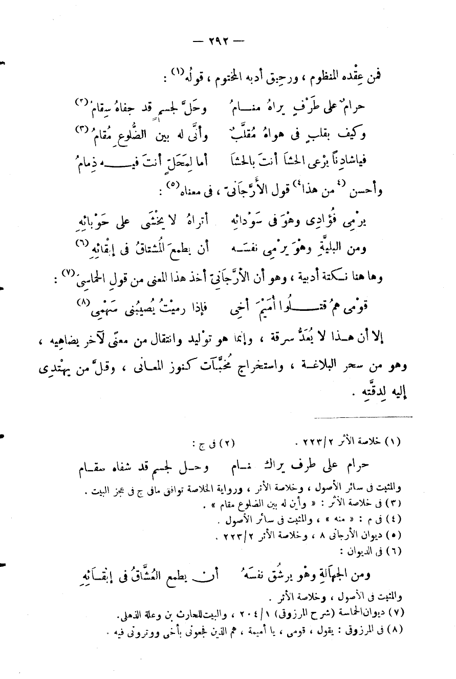 وهاهنا نكتة أدبية، وهو أن الأرجاني أخذ هذا المعنى من قول الحماسي: