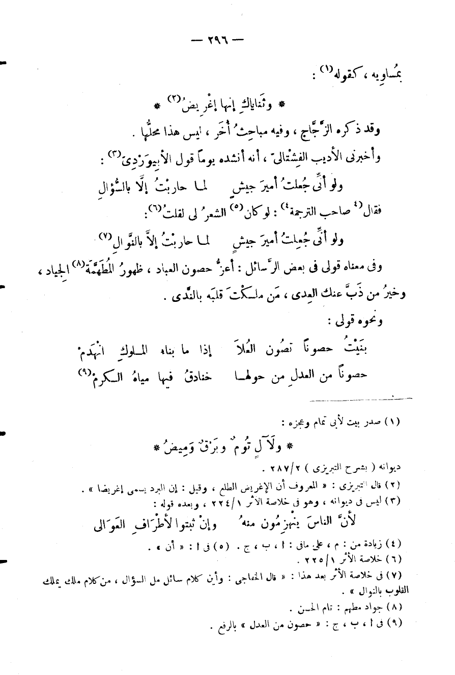 وفي معناه قولي في بعض الرسائل: أعز حصون العباد، ظهور المطهمة الجياد، وخير من ذب عنك العدى، من ملكت قلبه بالندى.