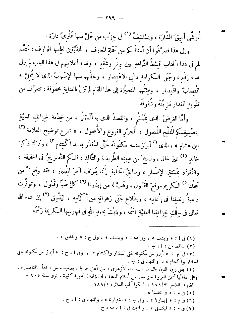 وأما الغرض الذي يممتم، والقصد الذي به ألممتم، من خدمة خزانتنا العلية بتصنيفكم المنقح الفصول، المحرر الفروع والأصول،) شرح توضيح العلامة ابن هشام (الذي أبرز منه مكنونه حتى استنار بعد اكتممام، وترك ذكر خالد غير خالد، ونسخ من صيته الطريف والتالد، فلكم التصريح في الحقيقة، والتفرد بمستتر الإضمار، وسابق الحلبة إنما يعرف آخر المضمار، فقد وقع من محلنا الكريم موقع القبول، وهب لنا من إيثارنا كل صبا وقبول، وتوفرت داعية رغبتنا في إتمامه، وإطلاع جنى زهراته من أكمامه، ليتسق إن شاء الله تعالى في سلك خزانتنا العلية اسمه، ويثبت بحمد الله في فهارسها الكريمة رسمه.