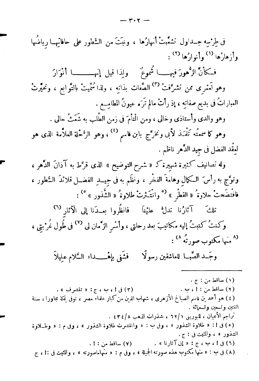 وله تصانيف كثيرة شهيرة ك) شرح التوضيح (الذي قرّط به آذان الدهر، وتوج به رأس الكمال وهامة الفخر، ونظم به في جيد الفضل قلائد السطور، فاتضحت حلاوة) القطر (وانتثرت طلاوة) الشذور (: