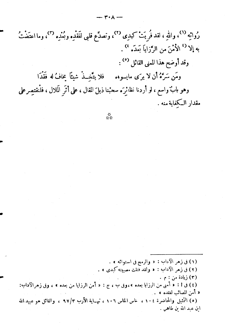 روائه، والله، لقد فريت كبدي، وتصدع قلبي لفقده وبعده، وما اعتضت به إلا الأمن من الرزايا بعده.