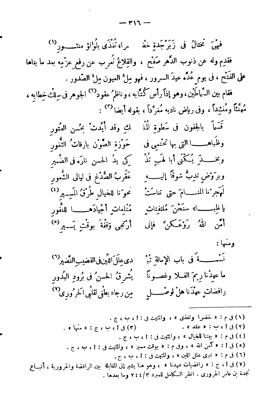 فقام بين السماطين، وهو إذا رأس كتابه، وناظم عقود الجوهر في سلك خطابه، مهنئا ومنشدا، وفي رياض ناديه مغردا، بقوله أيضا: