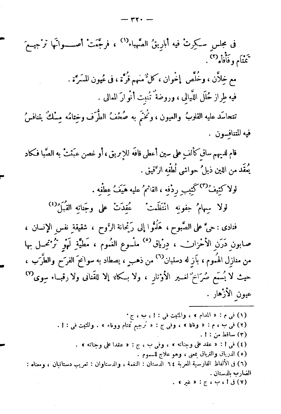 فنادى: حي على الصبوح، هلموا إلى ريحانة الروح، شقيقة نفس الإنسان، صابون درن الحزان، درياق ملسوع الغموم، مطية لهو ترتحل بها من منازل الهموم، باز له دستبان من ذهب، يصطاد به سوانح الفرح والطرب، حيث لا يسمع صراخ لغير الأوتار، ولا بكاء إلا للقناني ولا رقباء سوى عيون الأزهار.