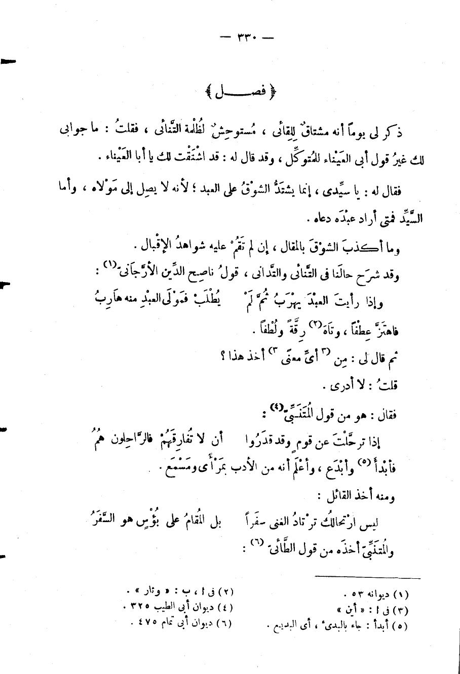 ذكر لي يوما أنه مشتاق للقائي، مستوحش لظلمة التنائي، فقلت ما جوابي لك غير قول أبي العيناء للمتوكل، وقد قال له: قد اشتقت لك يا أبا العيناء.