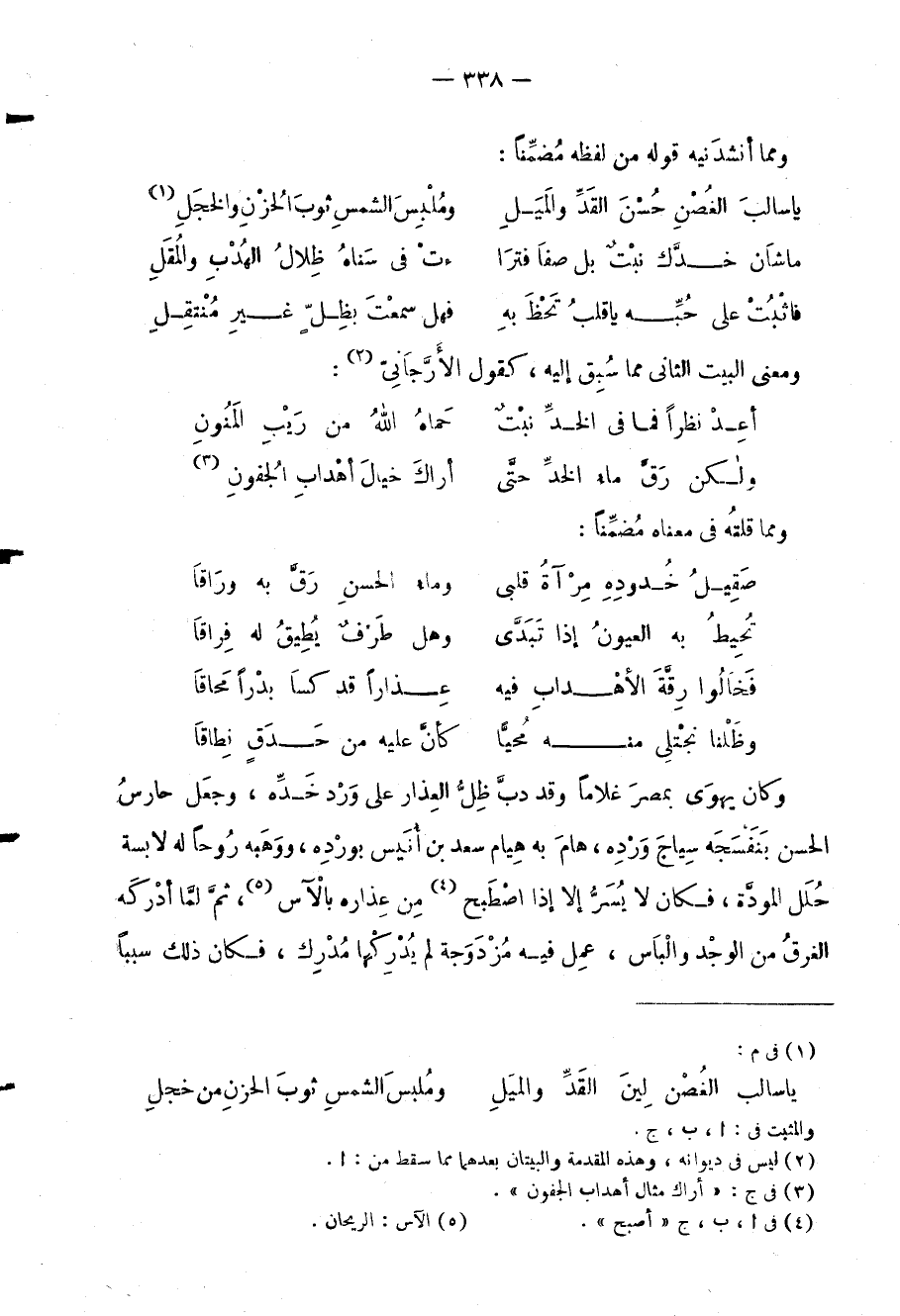 وكان يهوى بمصر غلاما وقد دب ظل العذار على ورد خده، وجعل حارس الحسن بنفسجه سياج ورده، هام به هيام سعد بن أنيس بورده، ووهبه روحا لابسة حلل المودة، فكان لا يسر إلا إذا اصطبح من عذاره بالآس ثم لما أدركه الغرق من الوجد واليأس، عمل فيه مزدوجة لم يدركها مدرك، فكان ذلك سببا