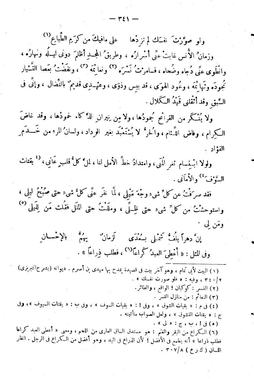 وزمان الأنس غابت عني أسراره، وطريق المجد أظلم دوني ليله ونهاره، وانطوى عني دجاه وضحاه، فسامرت نسره ونعائمه، ونفضت بعصا النسيار نجوده وتهائمه، وعود الهوى، قد يبس وذوى، وعهدي قديم بالنضال، وأني في السبق قد أثقلني قيد الكلال.