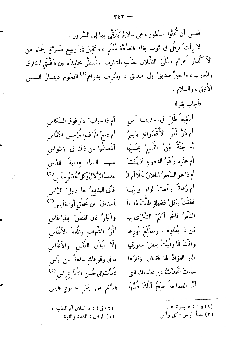 لا زلت ترفل في ثوب بقاء بالصحة معلم، وتقيل في ربيع مسرة حماه عن الاكدار محرم، ألما الظلال عذبى المشارب، تسطر محامده بين دفتي المشارق والمغارب، ما حن صديق إلى صديق، وصرف بدارهم النجوم دينار الشمس الأنيق، والسلام.
