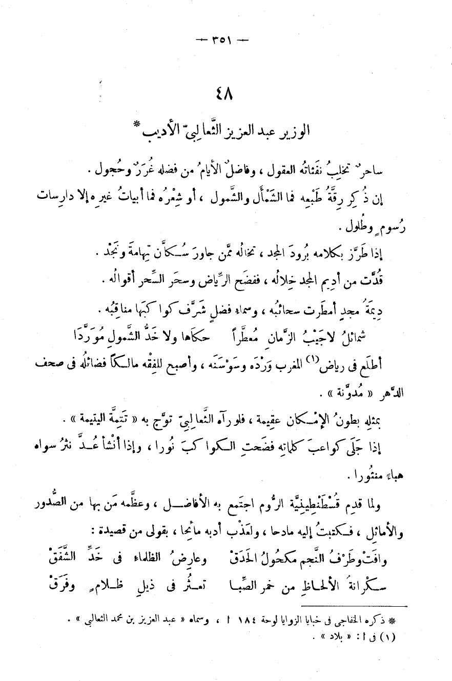 بمثله بطون الإمكان عقيمة، فلو رآه الثعالبي توج به) تتمة اليتيمة (.