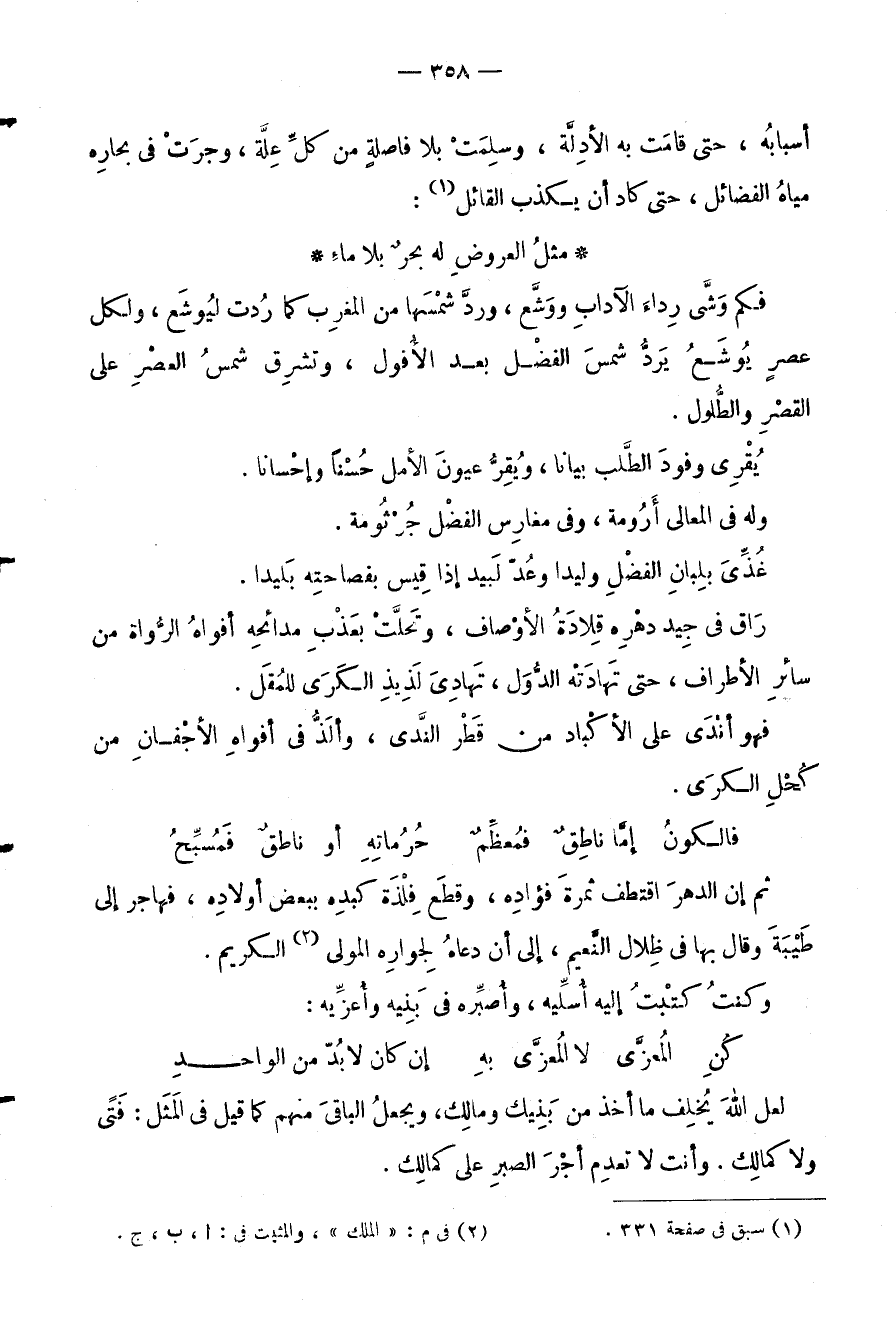 فكم وَشَّى رِداءَ الآدابِ ووَشَّع، وردَّ شمْسَها من المغرِب كما رُدت ليُوشَع، ولكل عصرٍ يُوشَعُ يَردُّ شمسَ الفضْل بعد الأُفول، وتشرِق شمسُ العصْرِ على القصْرِ والطُّلول.