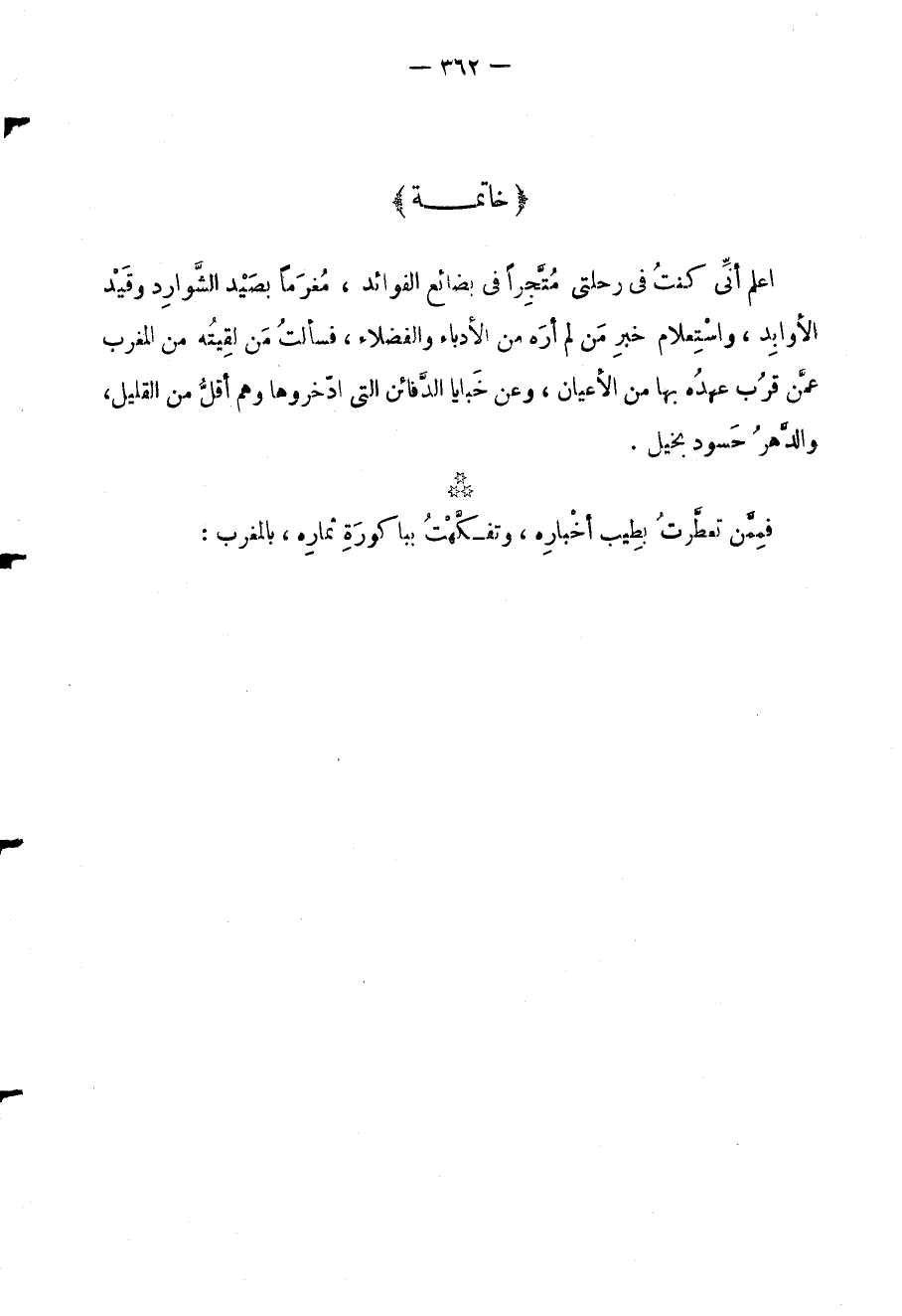 اعلم أنّى كنتُ في رحلتي مُتَّجِراً في بضائع الفوائد، مُغرَماً بَصْيد الشَّوارِد وقَيْد الأوابِد، اسْتِعلام خبرِ مَن لم أرَه من الأدباء والفضلاء، فسألتُ مَن لِقيتهُ من المغرب عمَّن قرُب عهدُه بها من الأعيان، وعن خَبايا الدَّفائن التي ادّخروها وهم أقلُّ من القليل، والدَّهرُ حَسود بخيل.