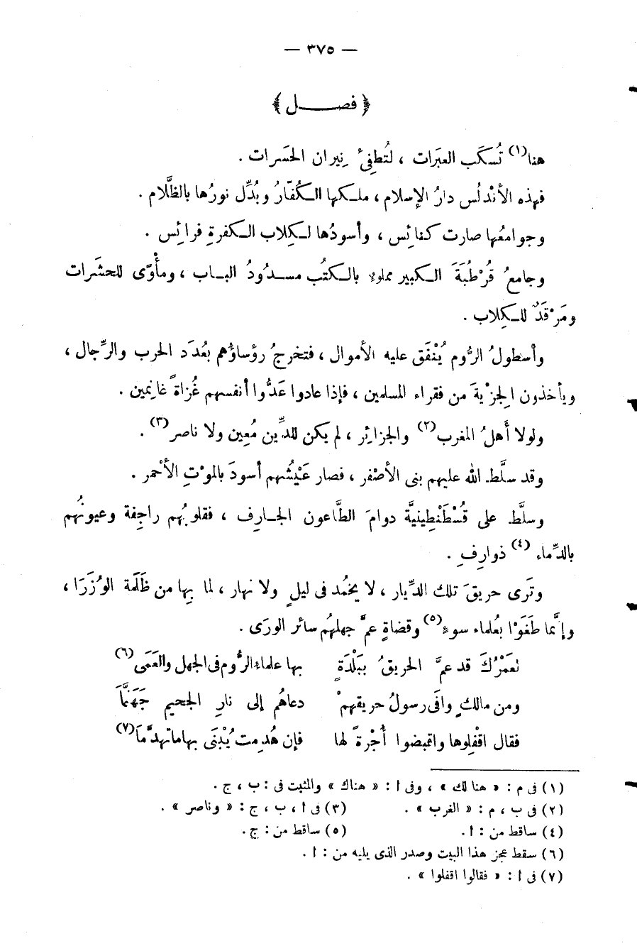 فهذه الأنْدلس دارُ الإسلام، ملكها الكفُارُ وبُدَّل نورُها بالظَّلام.
